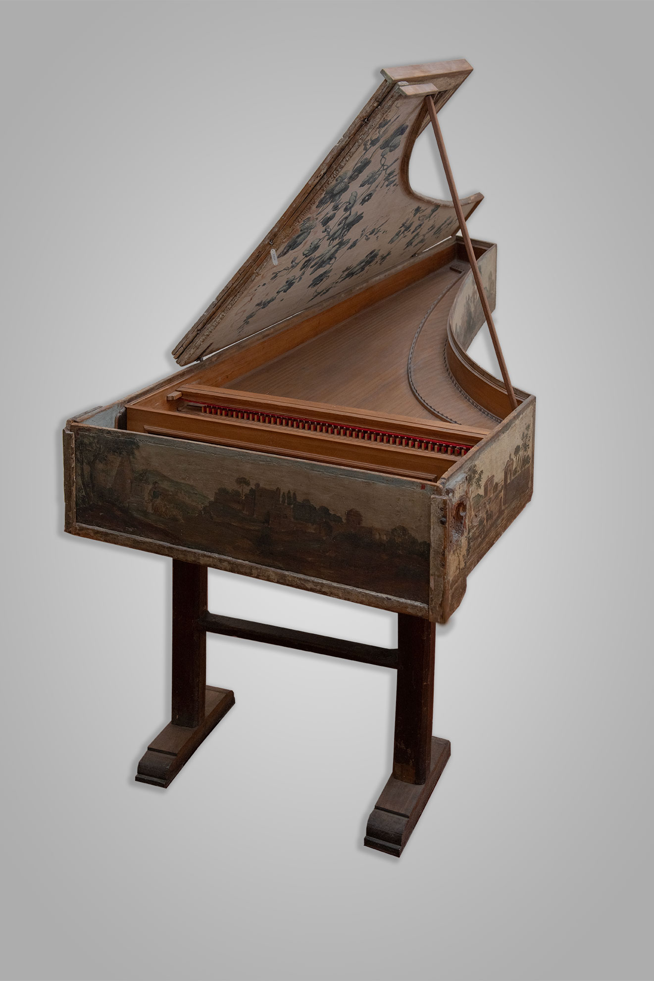 Il clavicembalo ha un ambito di 4 ottave di cui la prima corta. I tasti sono placcati in bosso e ebano; il piano armonico e le cornicette sono in cipresso, mentre i ponticelli sono in noce. Le fiancate verticali sono in rovere, quelle orizzontali in ebano. Lo strumento è interamente dipinto all’interno e all’esterno, come pure il coperchio. Lungo il fianco destro e la striscia discendente sono visibili scene di paesaggio; l’interno della seconda sezione del coperchio presenta brutte ridipinture a fiori e foglie su fondo bianco. (Descritto e catalogato anche in L. Cervelli, “La galleria armonica”, pg. 279).