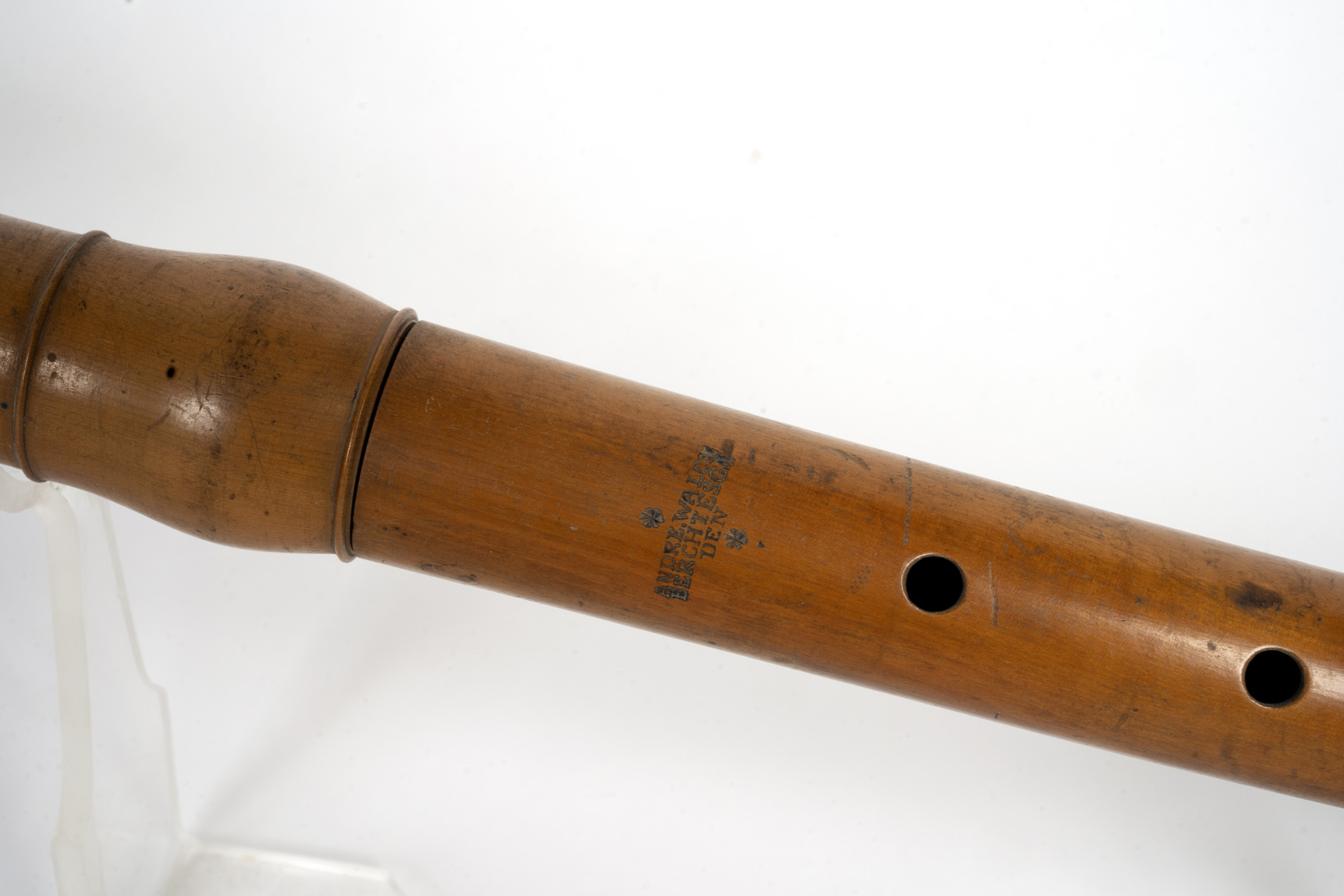 Il flauto traverso a 1 chiave quadrata in ottone è in 4 parti di bosso con 2 anelli di corno. Andrea Walsch lavorò presumibilmente intorno al 1825. (Catalogato e schedato anche in L. Cervelli, “La galleria armonica”, pg. 323).